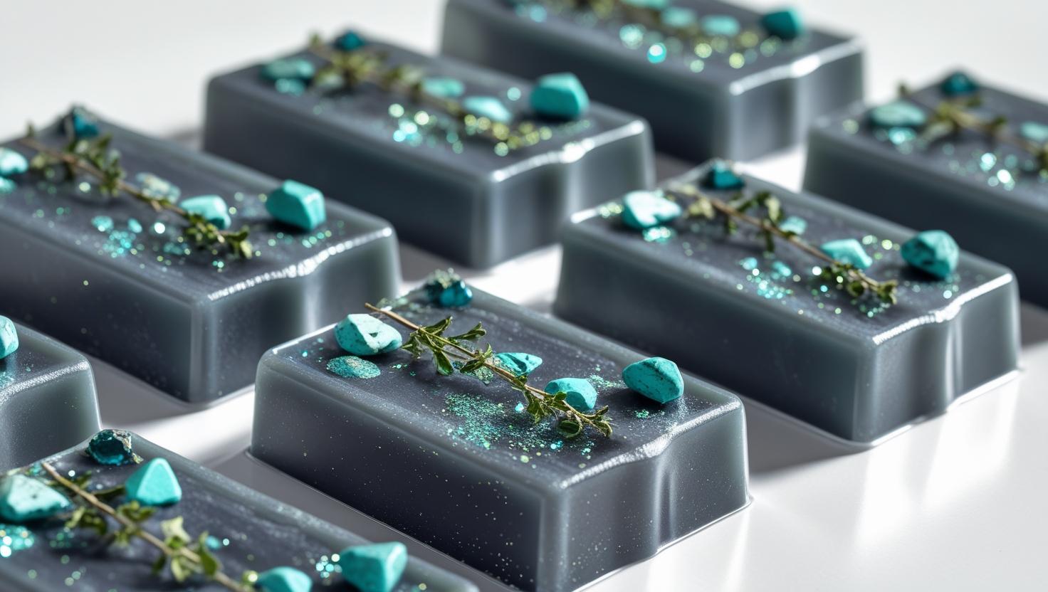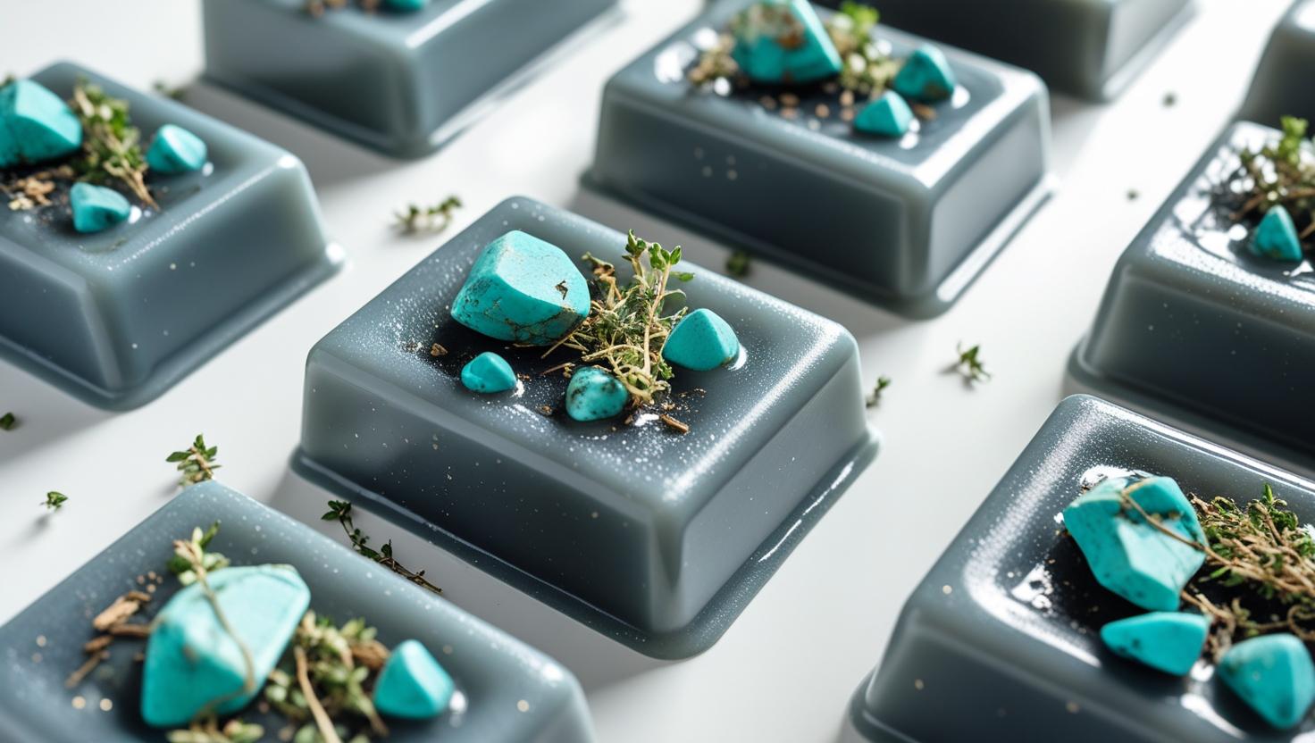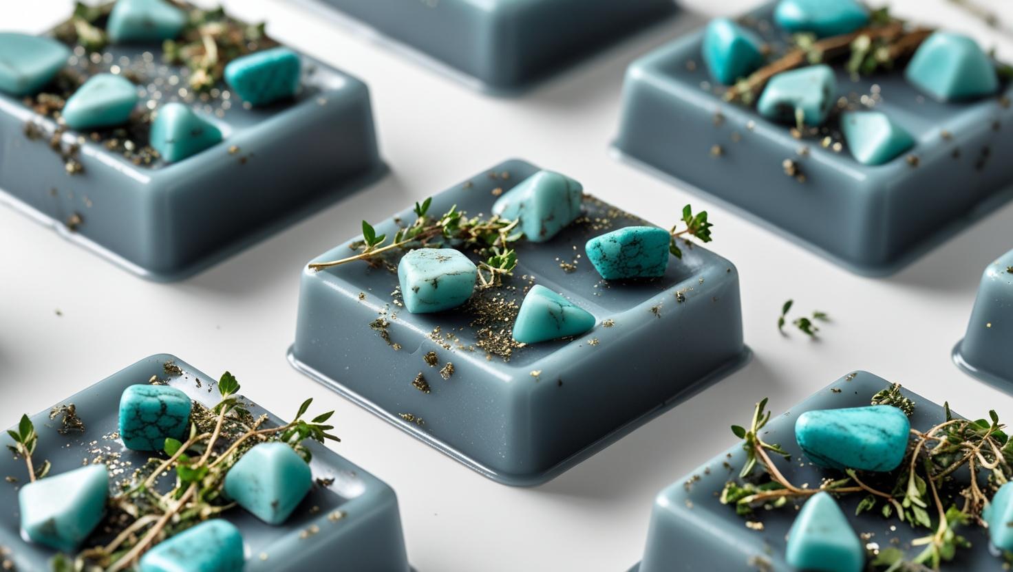 Each Ocean Breeze tart is thoughtfully infused with real turquoise stones and dried thyme, creating a multi-layered sensory experience that combines beautiful aromatherapy with meaningful natural elements.